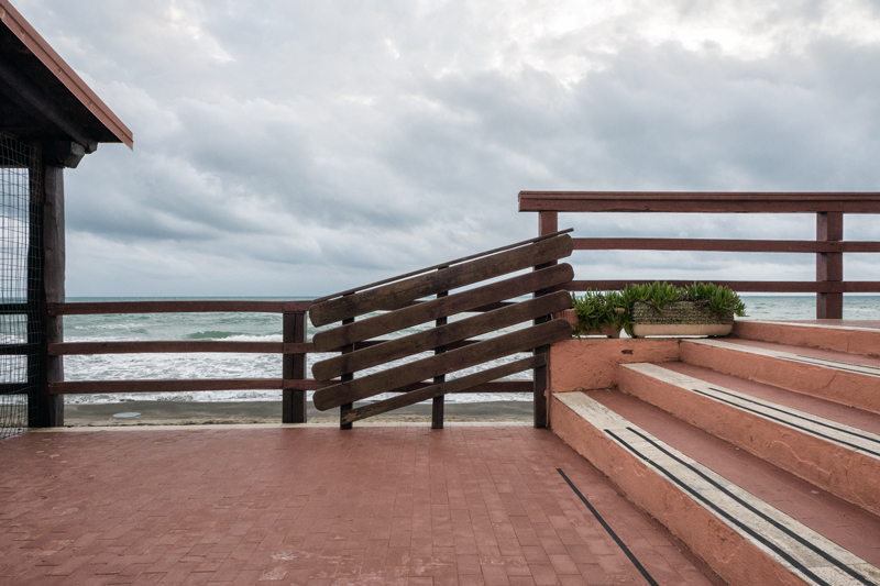 Eppure il respiro dell'acqua arriva in qualche modo attraverso le tinte del cielo che la sovrasta, e l'incresparsi delle onde che fanno capolino fra le assi del corrimano. Il rosa della pavimentazione di base, e il colpo di verde della vasca decorativa, vivacizzano a dovere una luminosità meteo contenutissima.