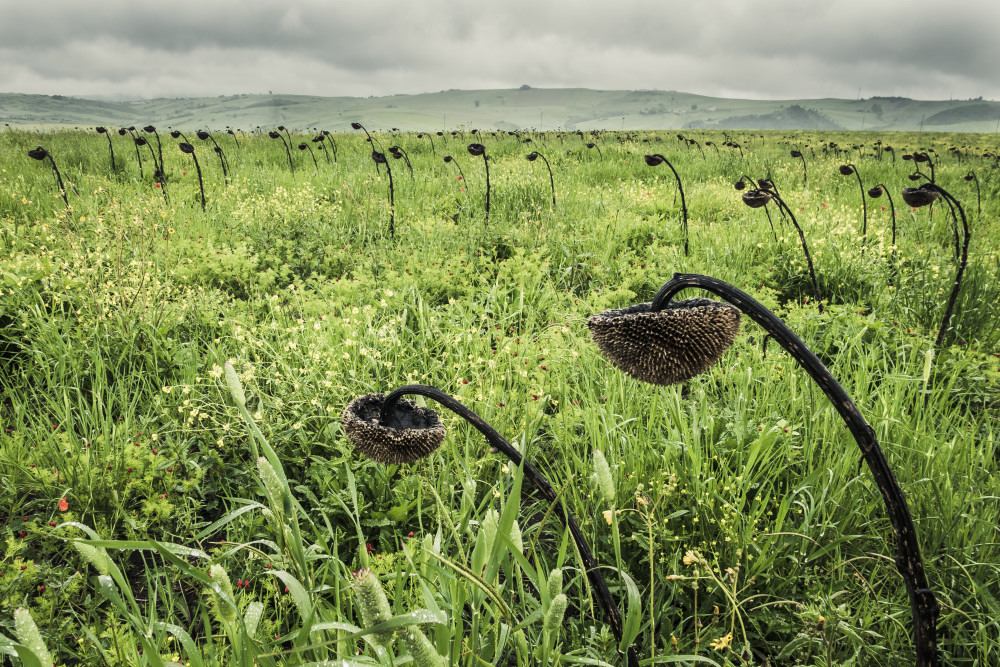 composta egregiamente, un paesaggio ha dell'irreale con questi girasoli ormai senza petali, scuri e con il capo chino che dal PP in ordine sparso si allontanano dal nostro sguardo.