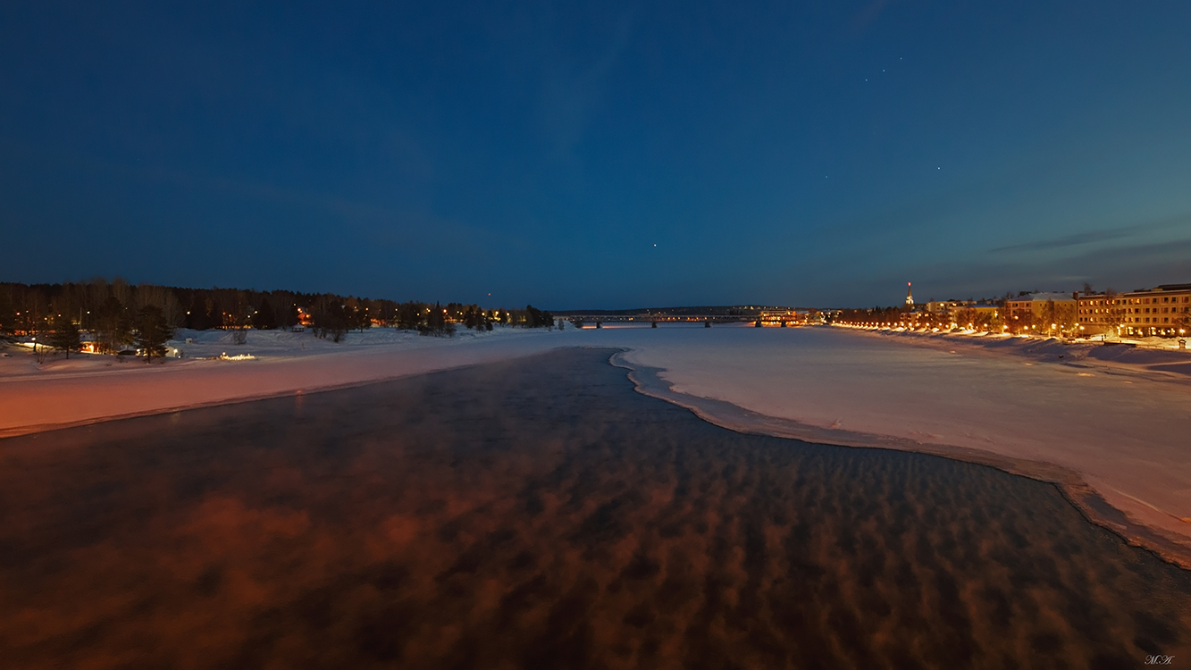 Mi trovavo a Rovaniemi capitale della Lapponia finlandese e stavo facendo delle foto all'ora blu. Al momento di tornarmene a casa a mangiare ho notato che sul fiume Kemijoki che bagna la città, nel tratto non ghiacciato appena la temperatura è scesa sotto i -10 l'acqua ha cominciato ad evaporare. Ho fatto sia una lunga esposizione, ma poi ho fatto questa con tempi più veloci per documentare il fenomeno. Sarà che non ero mai stato a -10 ma una cosa del genere non l'ho mai vista, e il fenomeno durava fino al mattino che si rialzavano le temperature.