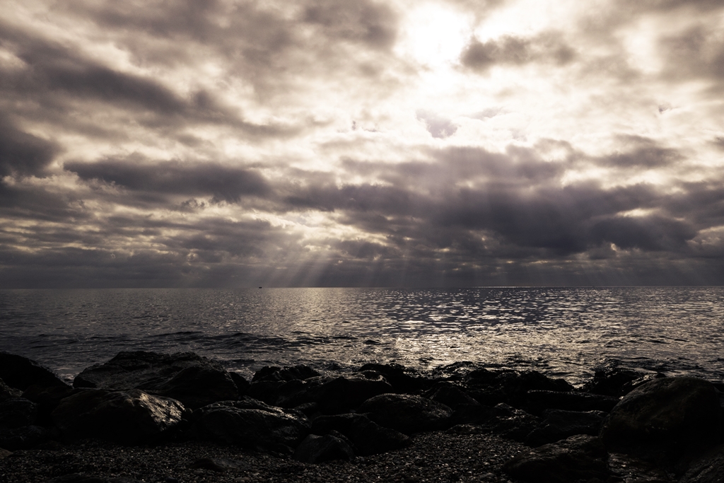 Cielo drammatico e una raggera di fasci luminosi che si diramano dallo squarcio importante. Mi piacciono molto.