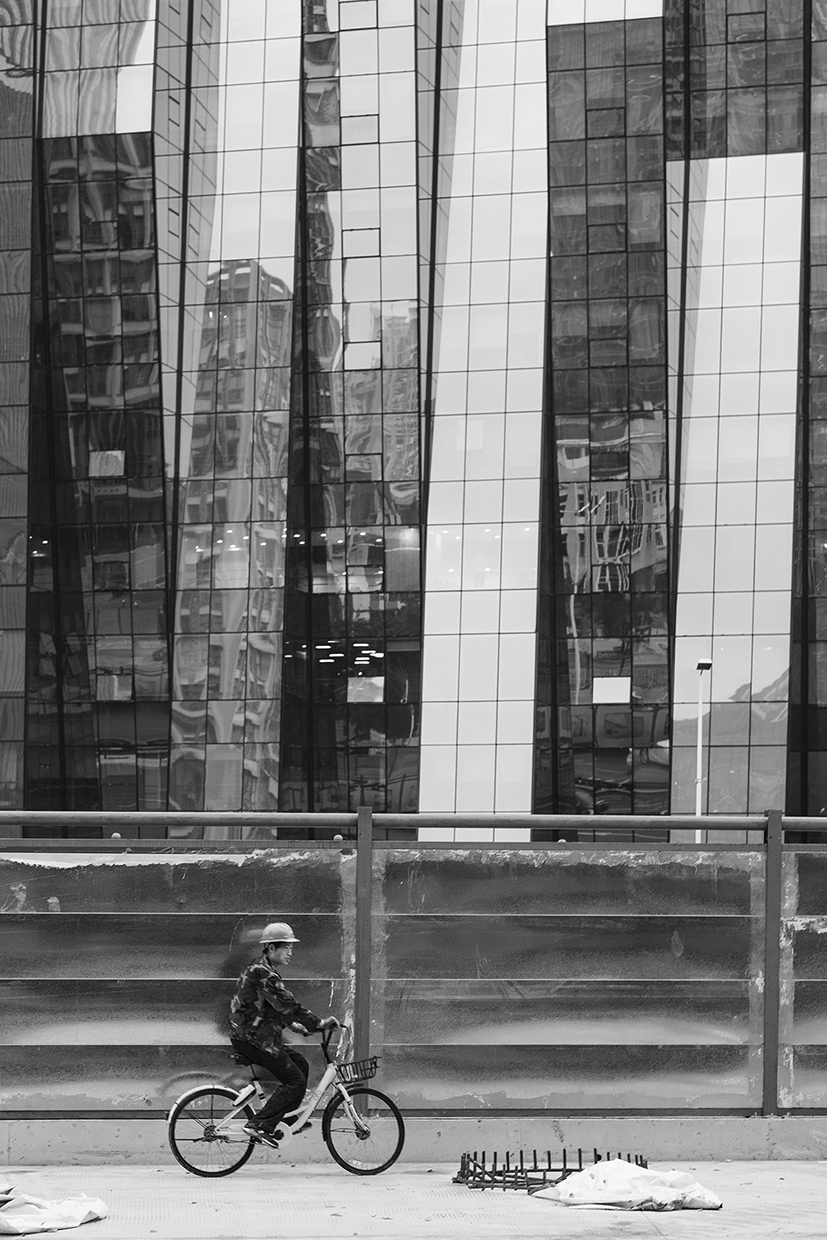 Mi piace il contrasto tra il piccolo uomo in bicicletta e la grande ed opprimente struttura che gli sta dietro, struttura che poi rimanda ad altri e possenti ed invadenti edifici. Efficace il bn. Mi piace il tutto. Poco street, ma una bella foto.