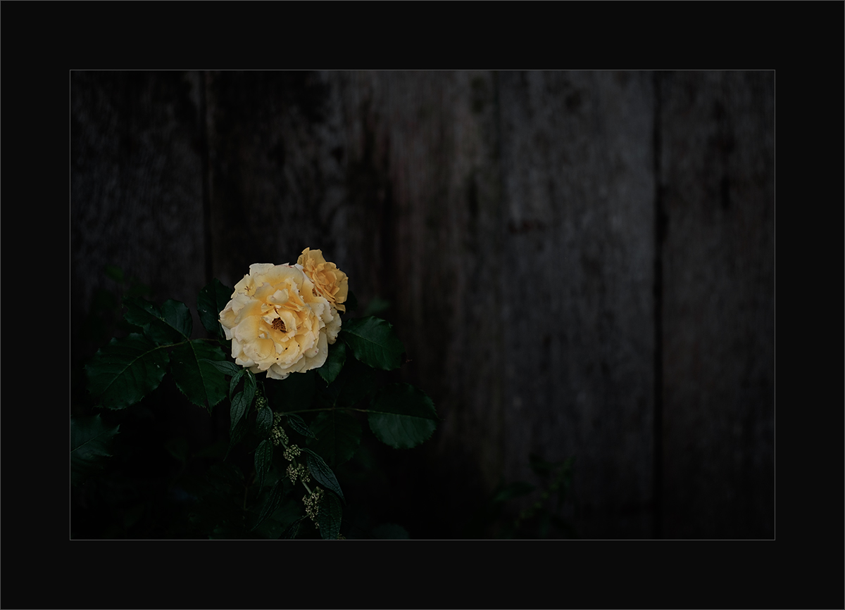 la grazia di questa piccola rosa gialla sbuca dallo sfondo scuro illuminando tutta l'immagine. Molto bella e delicata