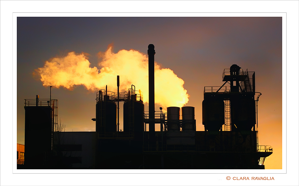 un bellissimo controluce valorizza la silhouette della fabbrica con la nuvola infuocata sprigionata dai camini. Composizione, luce nitidezza tutto perfetto e preferito