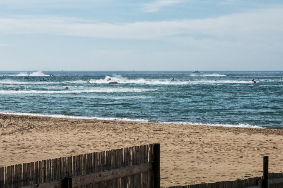 La "seghettatura" in primo piano distoglie dalle moto d'acqua e dal mare.