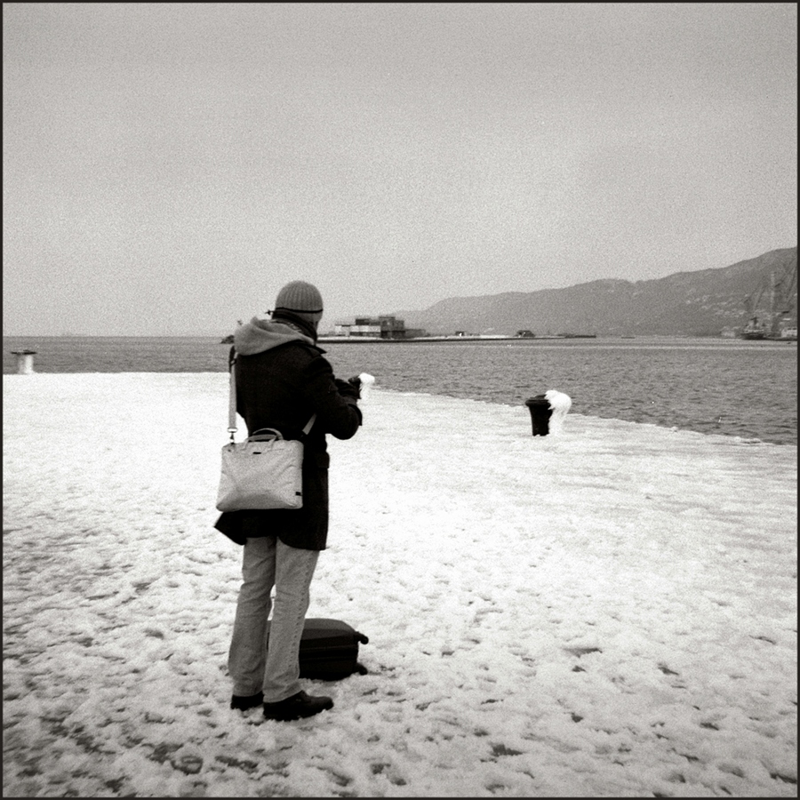 Grazie Nicola per il graditissimo commento. La foto risale a questo inverno,mi ero avventurato sul molo Audace,completamente ghiacciato,con un forte vento che rendeva precario l'equilibrio,la temperatura di vari gradi sotto lo zero mi aveva anestetizzato le mani,c'era solo questo ragazzo che cercava anche lui di scattare qualche foto con il telefonino.Sembravamo confinati in una zona ostile e pericolosa ed il pensiero è andato alla "valle della morte" anche se la location era completamente diversa.Avevo con me l'Eura Ferrania,mia prima macchina regalatami quando avevo 14 anni,un solo tempo di scatto circa 1/50,due diaframmi f.8 e f.12,tutta plastica,anche l'ottica.Ti mostro un secondo scatto ancora più mosso! Ciao,Sergio.