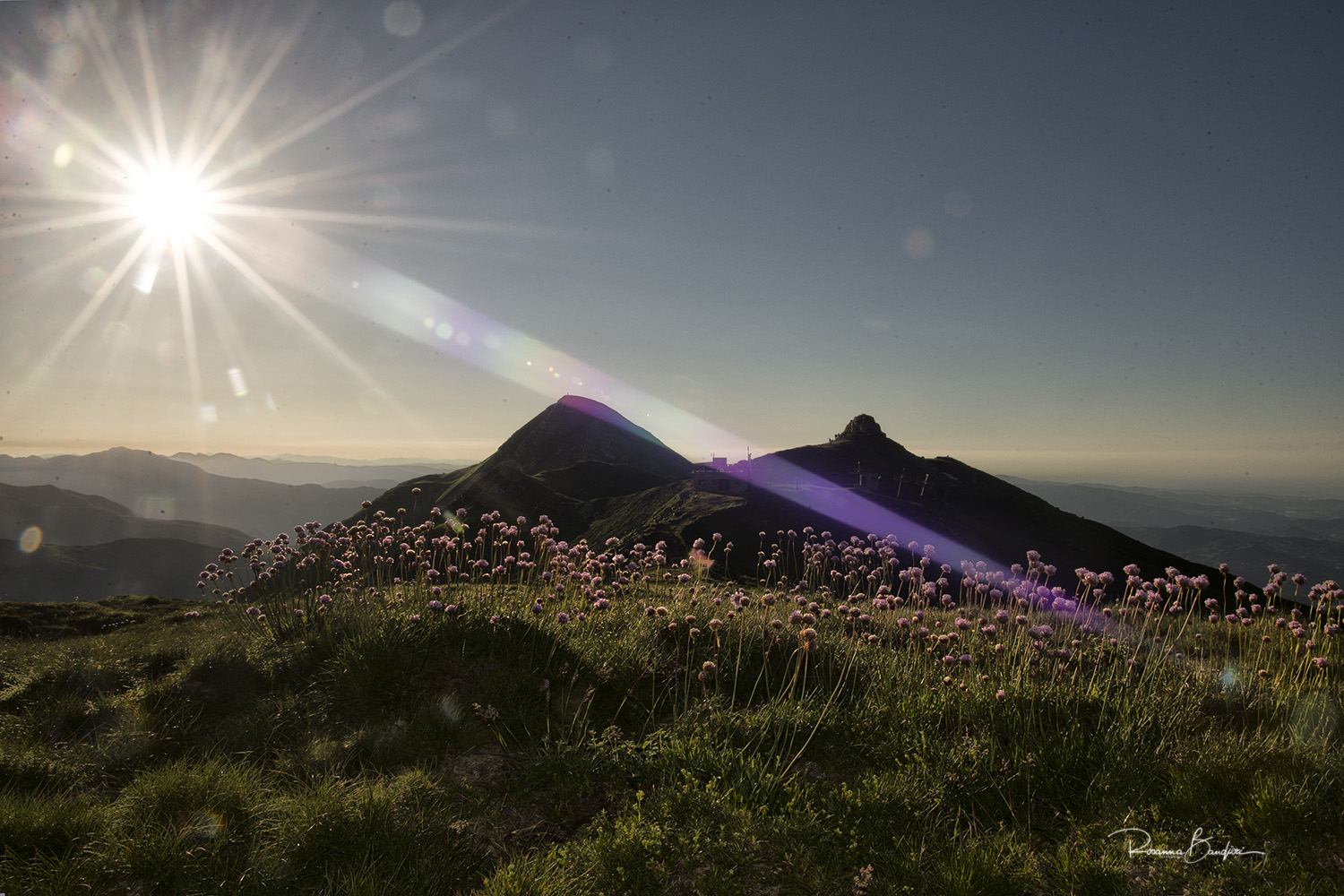 La prima cosa che mi colpisce è il raggio che è esattamente della stessa nuances dei fiori d aglio, come raggruppati in un vaso sull’altopiano. La seconda è la tua voglia di trasmettere quel saluto del sole, lo stesso bacio che hai percepito su te, e la terza cosa è quanto l altitudine ti regali “segnali” , non a tutti è concesso un raggio “violetto”. Aaaaaa...c’è una quarta cosa! Tecnica che sai padroneggiare in ogni situazione ( pure su una ferrata al volo? )