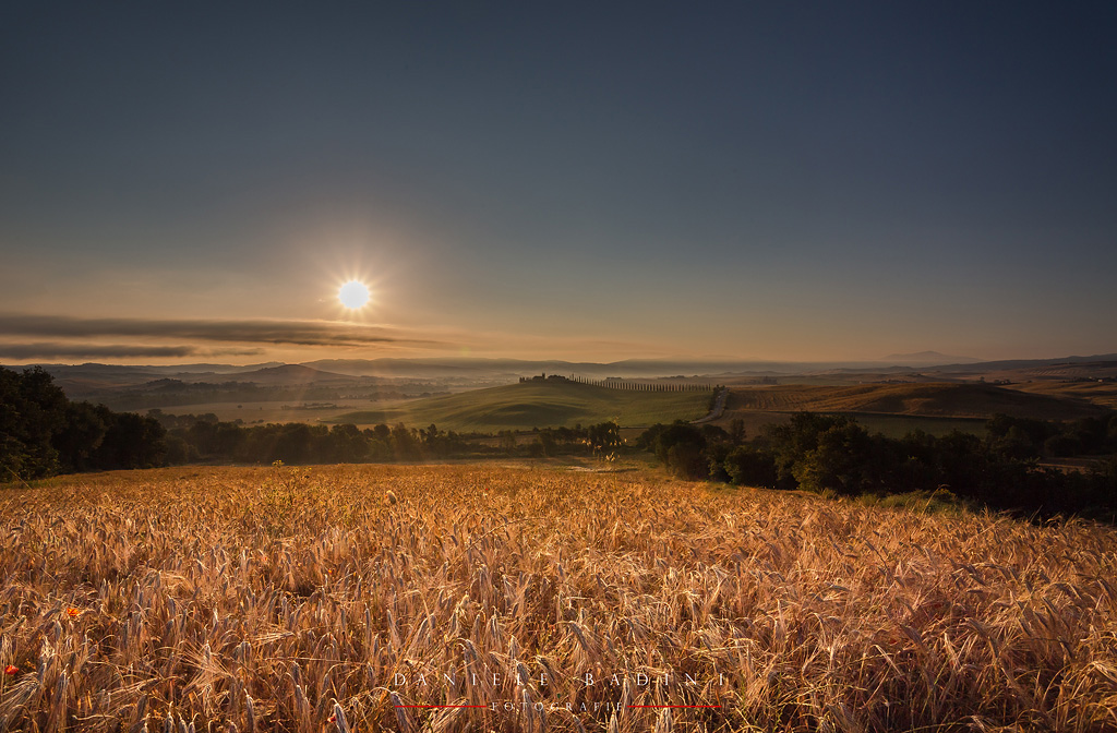 morbida luce del mattino che accarezza i campi di grano e le colline regalando un'atmosfera suggestiva, molto bella
