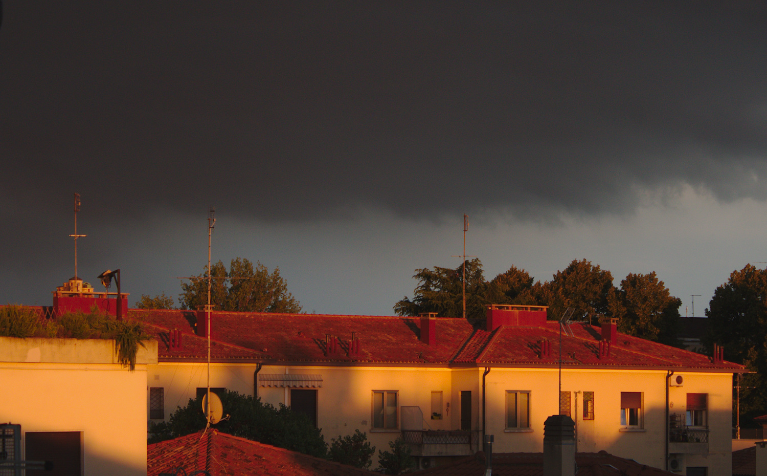 Qui invece la tempesta passa quasi in secondo piano di fronte alla giungla di antenne e comignoli... lo stesso colore del caseggiato sovrasta di gran lunga l'importanza del cielo. |