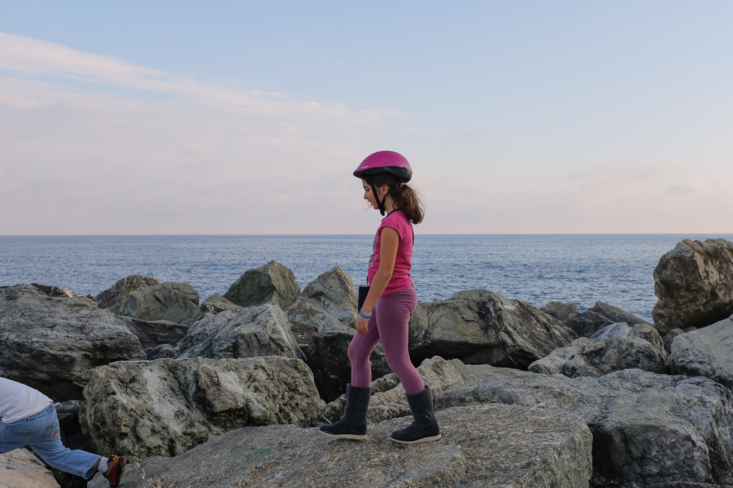 La foto e' ferma, non mossa, si muove un attimo dopo che distogliamo lo squardo dalla bimba, in una tenuta viola fucsia stupenda che si sostituisce ad un tramonto che forse arriverà piu' tardi, dopo che il papa' avrà recuperato il vivace bimbo, forse a mollo, o forse no.