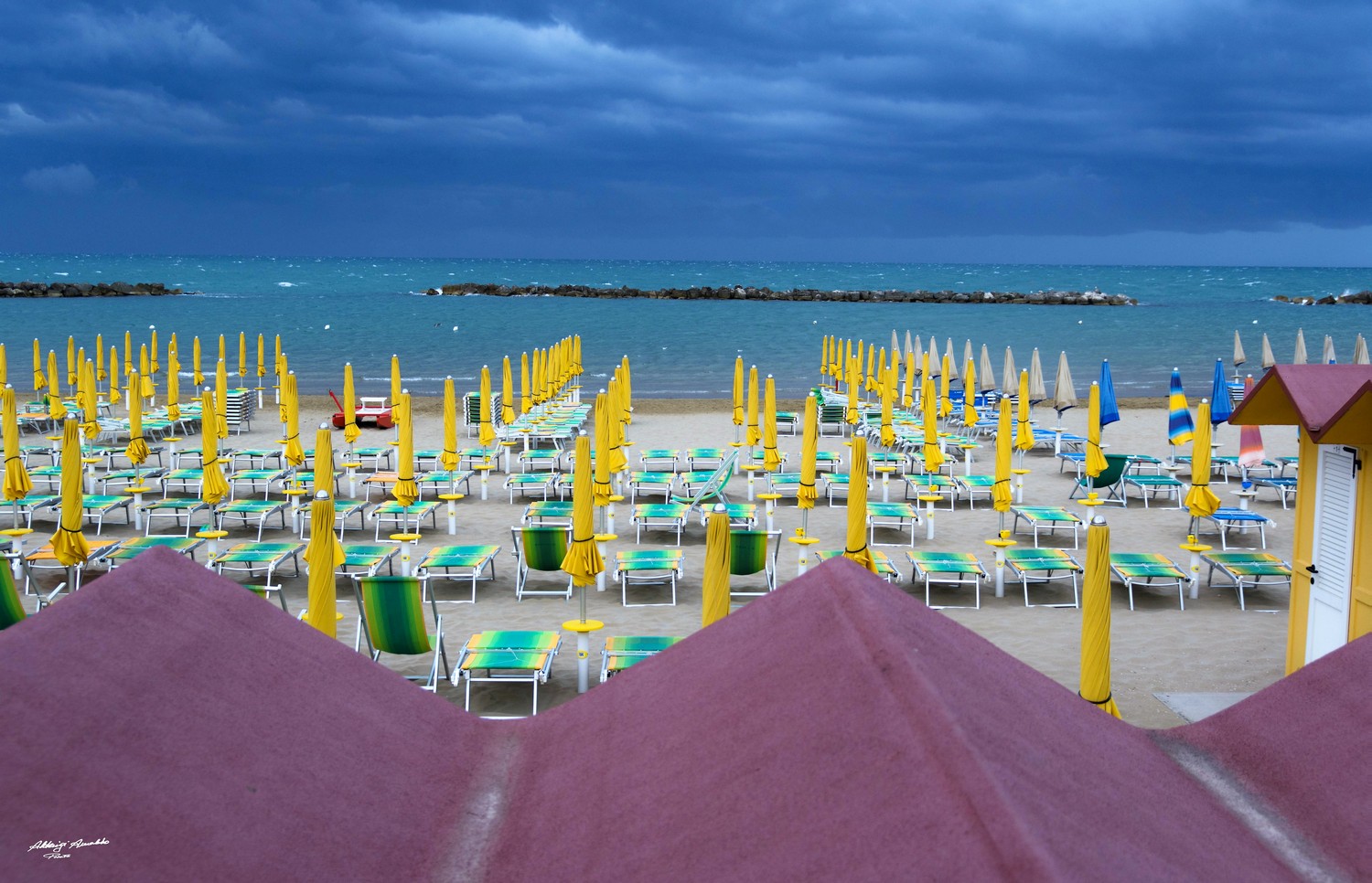 Colori squillanti di questa ordinata spiaggia in contrasto con il plumbeo cielo che tiene lontani i bagnanti.Bella immagine. Ciao