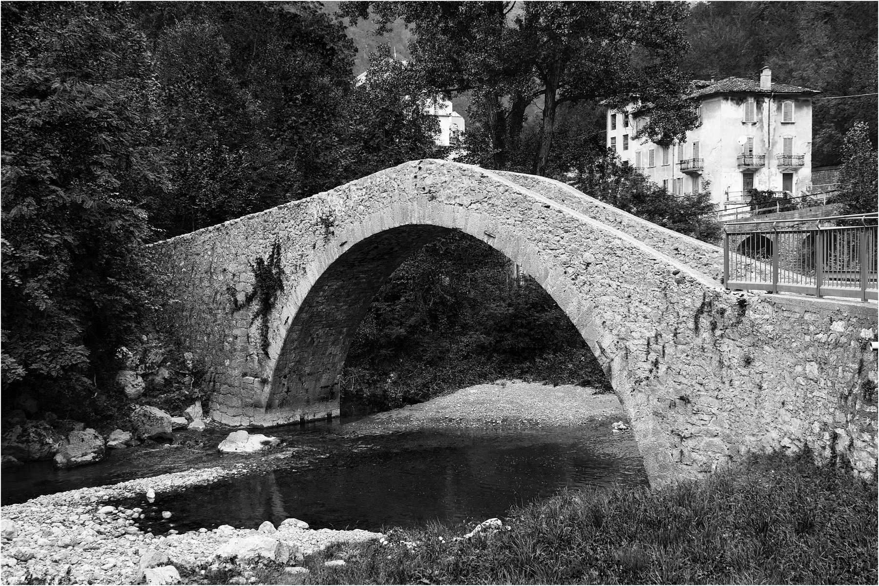 Bello scorcio ben ripreso, buono il bn scuro ma nitido La pianta sulla sx del ponte sembra un ragno gigantesco che si arrampica… Immagine gradevole.