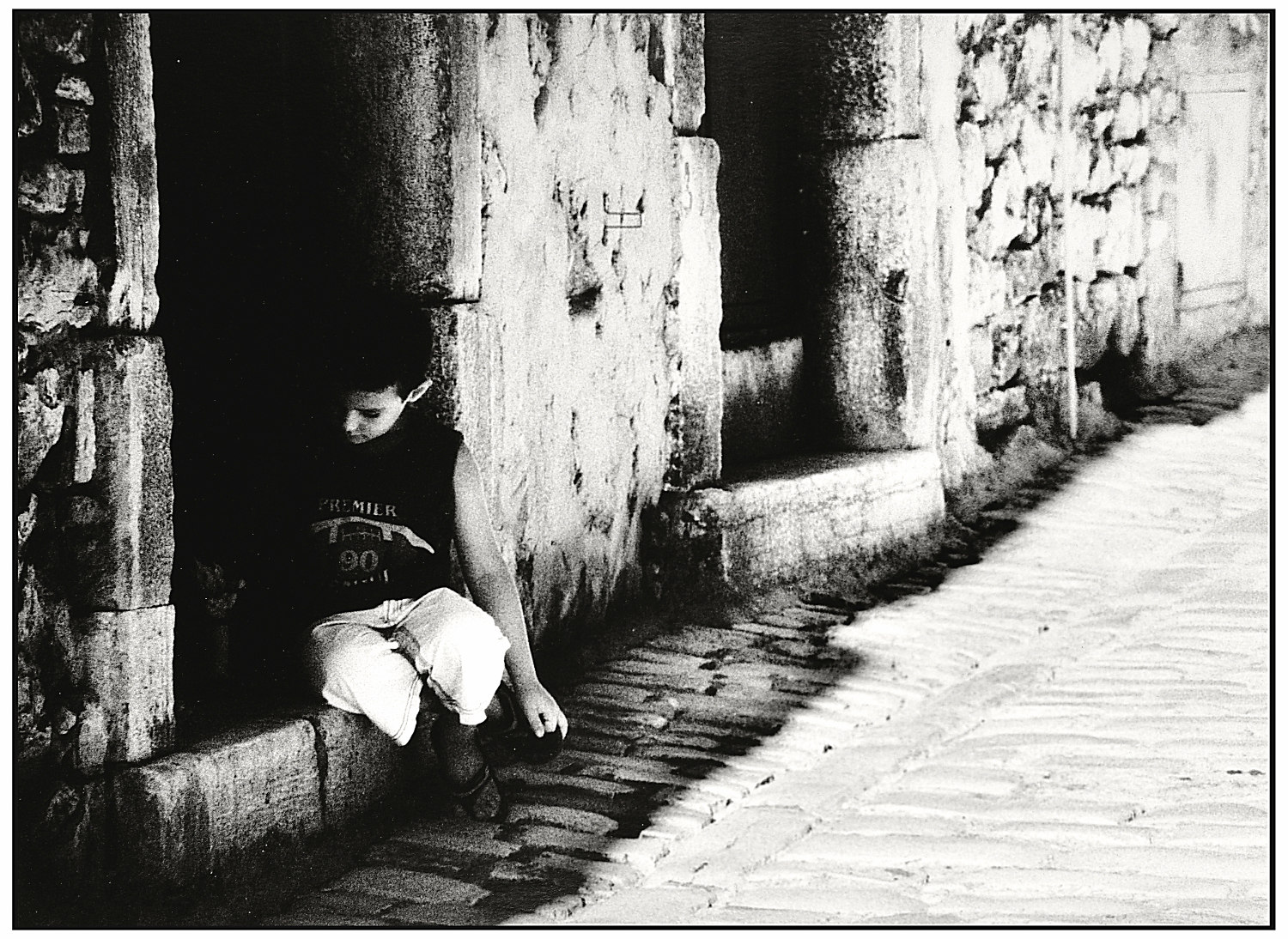 La foto è molto bella. Il bambino serio in disparte, che ci mostra solo mezzo viso, e l’altra metà che se la mangia il buio. Scenario scarno di pietre e sassi, luce e ombra, contrastatissimo.