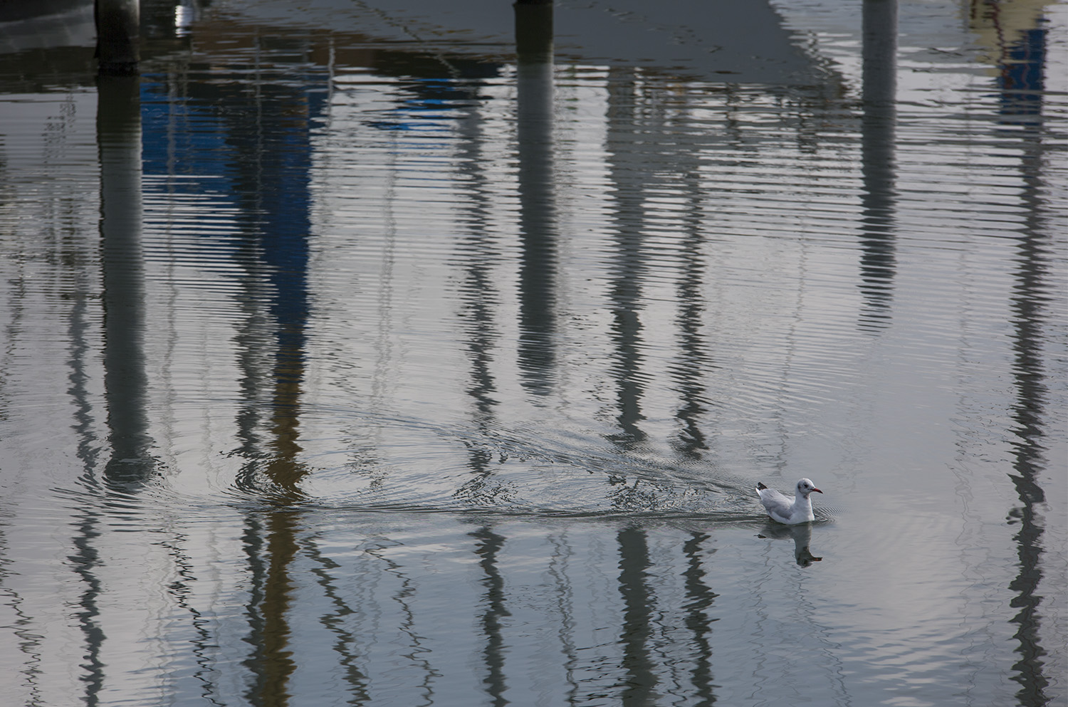 Immagine piacevole, il gabbiano che solitario se ne va rompendo gli schemi del riflesso...bella la resa dell'acqua.