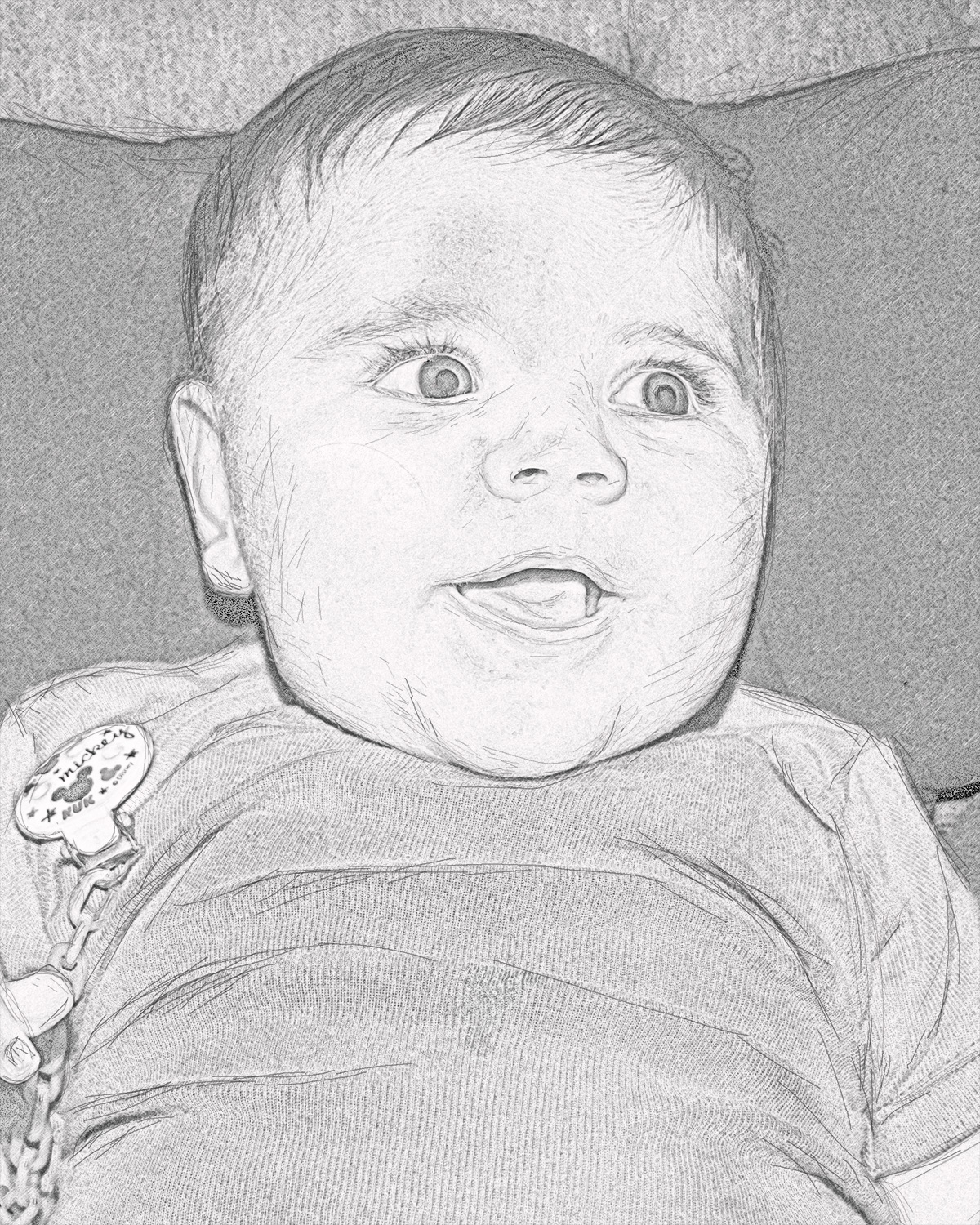 Questo è uno scatto "rubato" nel senso che il bimbo era attirato da un'altra persona, e tu l'hai fotografato probabilmente con il flash (visto le ombre create dentro la bocca, sulla lingua più precisamente e maggiormente visibile al lobo dell'orecchio e alla gola), poi stilizzato in matita o disegno.