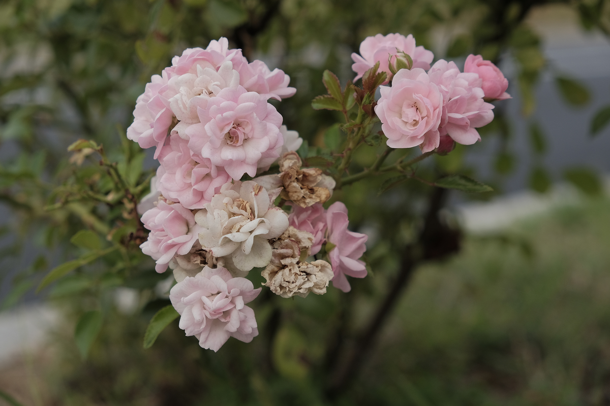 Le piccole rose, in boccio, nel pieno del loro vigore, appassite e poi sfiorite, per svanire confondendosi nello sfocato dello sfondo.