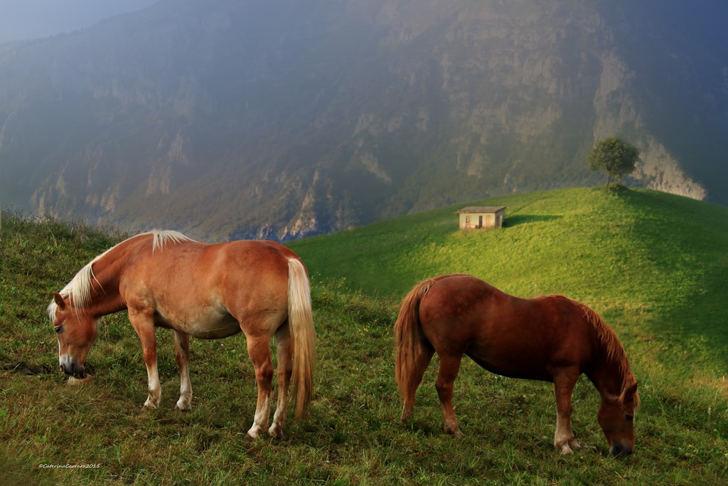 Troppo presenti i due cavalli, ben ripresi, ma che di fatto ostacolano la visione paesaggistica, si ha la voglia di oltrepassare i due quadrupedi ed andare ad ammirare cio' che c'è laggiu'.