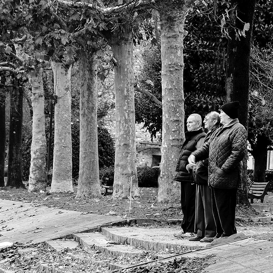 | Mi piace questa sequenza di elementi ripetuti e profilati. Gli anziani in posa, il filare di alberi, i gradini..