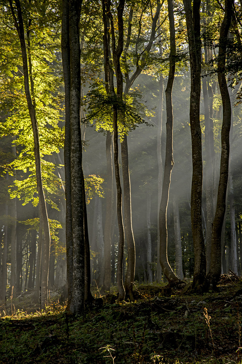 Bella luce filtrante attraverso questi faggi..ottimo scatto e composizione. buon fine di serata.