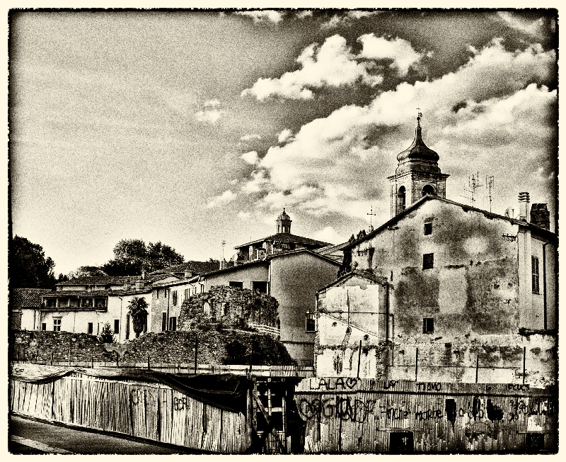 Questo tipo di viraggio con grana e cornice particolarmente invasiva attiene alla sfera del gusto personale, a me non piace, mi limito a dire che lo scorcio poteva essere interessante anche se da raddrizzare a mio parere le linee verticali delle case, ma in questo modo poco si riesce ad apprezzare.