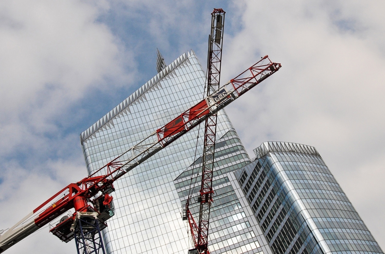 Interessante l'incrocio tra elementi statici e dinamici, tra struttura e gru, il posizionamento pendente pero' dei palazzi sembra essere stato inserito appositamente per creare questa specie di X, la pendenza innaturale non da forza alla foto, anzi.