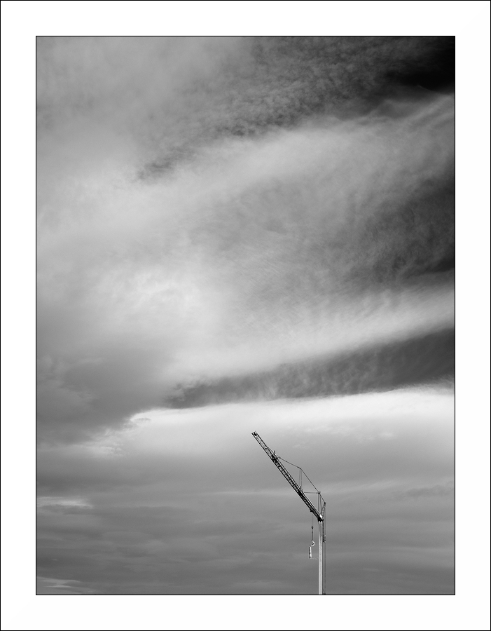 Strisce di cielo e strisce di acciaio come a cercare una intersezione, un contatto; la gru come una antenna che scruta oltre lo spiraglio d'atmosfera nella speranza di risposta...