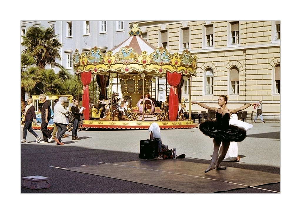 Molto bella questo scatto,ai fermato la ballerina ed i passanti tutti a tempo con il piede sollevato Bravo. buona giornata