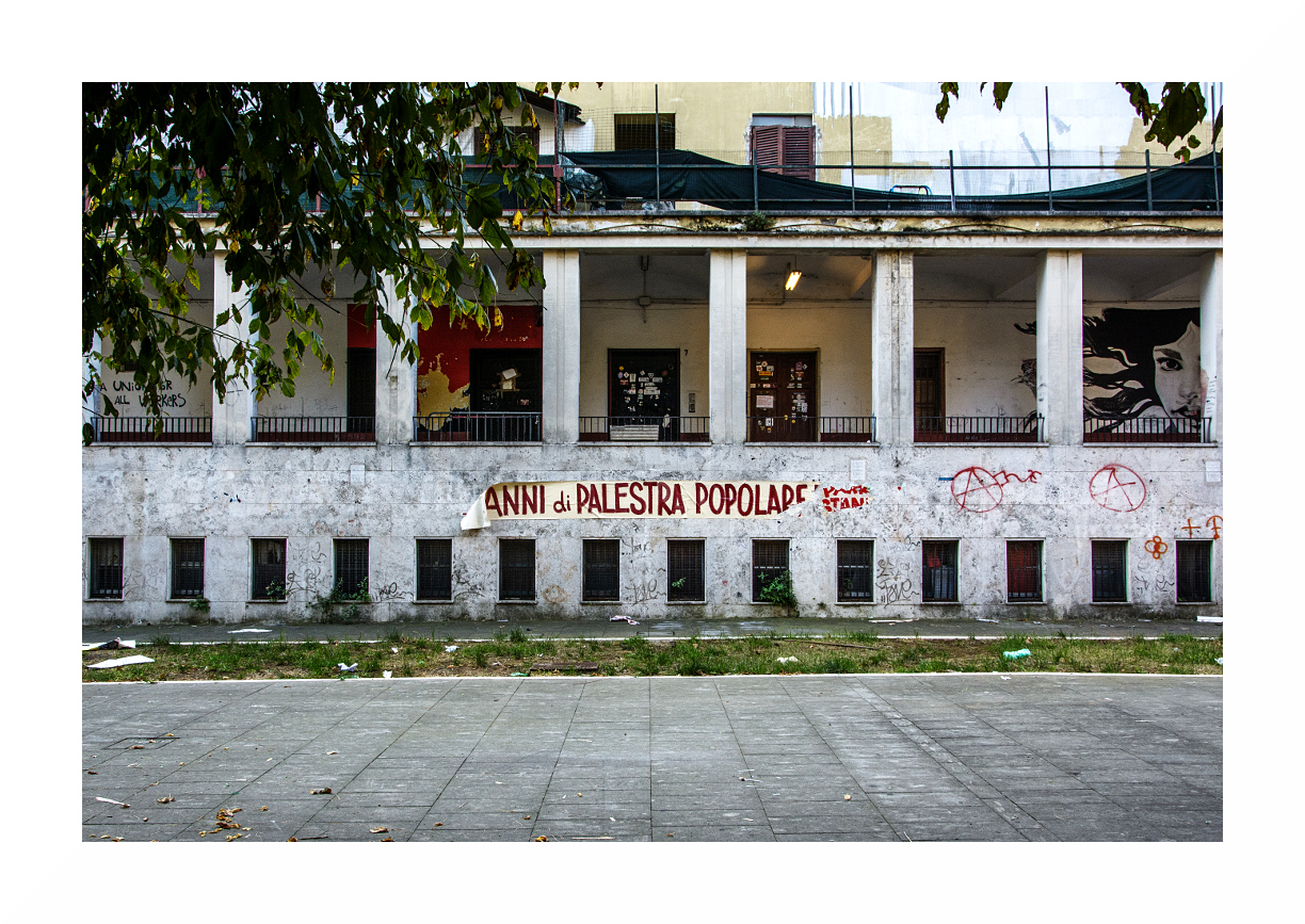 Le linee e geometrie di questa architettura razionalista contrastano con l'anarchico disordine di scritte e disegni.Ottima composizione. Ciao