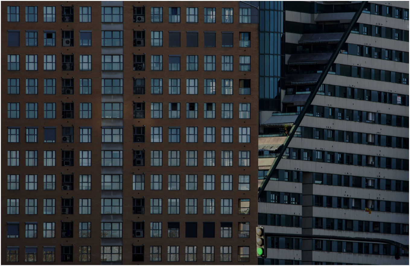 Pattern architettonico rigoroso, geometrico, spezzato.. un bel gioco visivo dove anche quel timido e minuscolo semaforo verde ci sta come una fogliolina di basilico su una buona pizza Ok!