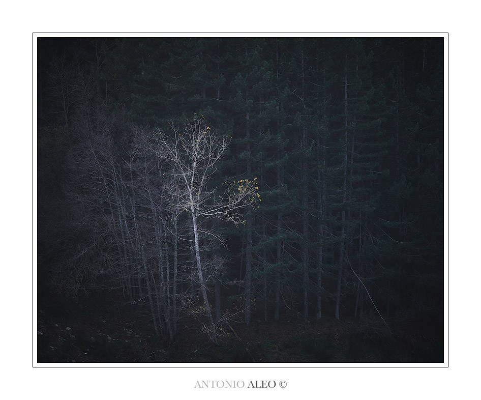 Se analizziamo l’immagine valutando solamente il “cosa”, ossia cosa è rappresentato, diremmo che è uno scorcio quasi banale (perdona il termine, ma lo uso per spiegare la mia idea). Se invece esaminiamo il “come”, ossia in che modalità la scena è rappresentata, allora tutto cambia e ne deriva un’immagine sopra le righe. Molti alberi ma uno e solo uno diventa oggetto e protagonista. Soggetto in modo inconfutabile. L’albero in evidenza non è solo ma circondato da altri vegetali uguali. Essi sono tuttavia come appena accennati, ne percepiamo la presenza ma essa non risalta concretamente. Quanto rende l’albero in primo piano indiscusso elemento presente e protagonista, è il suo essere pervaso da una luminosità unica e diversa. Nessun colore, nessuna forma preponderante che lo distingue….sarebbero state caratteristiche marginali per farlo risaltare, i colori delle piante sono simili ed anche le forme. Quindi luminosità (ottenuta anche con una furba e sapiente post produzione) . Il resto viene “ridotto” a puro sfondo scuro; ma uno sfondo non nero, in modo che sia intuibile l’ambientazione dello scatto. bella realizzazione.