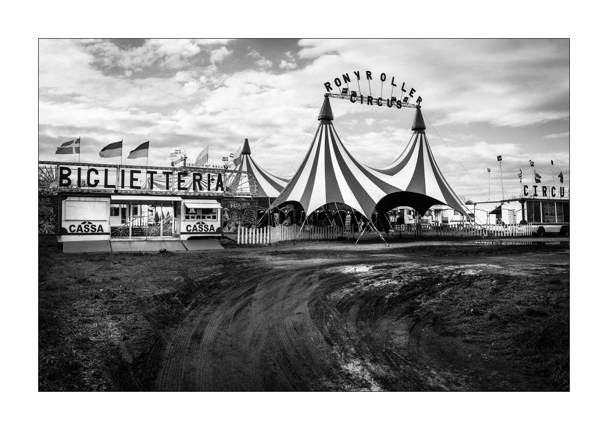 Il terreno umido e segnato dal passaggio dei camion ci introduce a questo circo rutilante di bandiere,tendoni e casotti su ruote.Una magia che sorge e scompare nel giro di pochi giorni,una fabbrica senza ciminiere che produce emozioni.Bellissima e malinconica immagine,ottimo bn.Complimenti e preferita. Ciao,Sergio.  _________________ Sergio Demitri https://www.flickr.com/photos/124946035@N02/ |