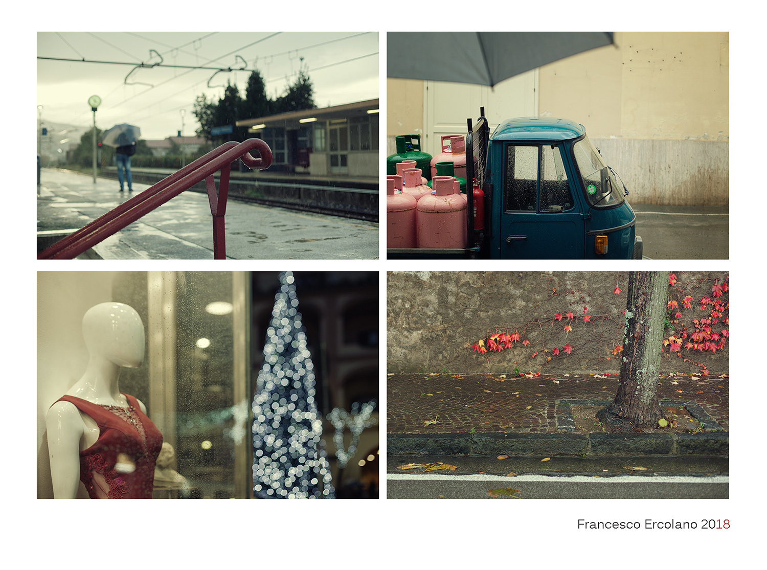 Un polittico molto efficace e ben fatto. Non vi è una narrazione. Le quattro immagini dalle quali è formato non formano un racconto ma “illustrano” uno stato d’animo. Effettivamente si tratta di immagini che illustrano luoghi o scorci e dettagli. Non ci sono persone (tranne un individuo sfocato nella prima immagine). Tuttavia le quattro figure, accomunate dalla pioggia, raffigurano situazioni dove l’elemento umano è mentalmente presente. Luoghi e situazioni “costruite” ed usate dalle persone, non ci sarebbero senza di loro. Quindi, a mio giudizio, risultano ancora maggiormente efficaci perché richiamano l’idea delle persone che vivono quei luoghi ed usano quegli strumenti. Le fotografie sono permeate dalla presenza umana ma essa risulta generica, quasi un simbolo di una persona, non un individuo preciso e riconoscibile. Questo permette a ciascuno di identificarsi, essere in sintonia con le situazioni presentate: una stazione qualunque, un’Ape carica di bombole del gas, la vetrina natalizia di un negozio, un marciapiede qualunque. Tutti luoghi diversi fra loro ma che hanno un elemento di fondo che li unisce : il tempo atmosferico piovoso. Fonte di sensazioni e pensieri; veicolo per fare sorgere una sensazione comune e molto permeante. un esempio lampante dell’importanza del “come” per veicolare il “perché” e rendere un’opera fotografica capace di comunicare sensazioni, sentimenti e stati d’animo. Vedendo questo politico possiamo arrivare a dire, senza ombra di dubbio, che la costruzione grafica, la scelta dei soggetti, i toni delle colorazioni utilizzati accomunano e rendono lo scatto capace di veicolare un messaggio. Poi vi è l’elemento cardine che accomuna le quattro parti: il tempo piovoso. Questo è il “soggetto” comune e fondamentale, tuttavia esso risulta maggiormente efficace grazie agli elementi costruttivi e grafici sopra citati. Il tutto funge e da “via maestra” che conduce immancabilmente al cuore espressivo del lavoro.