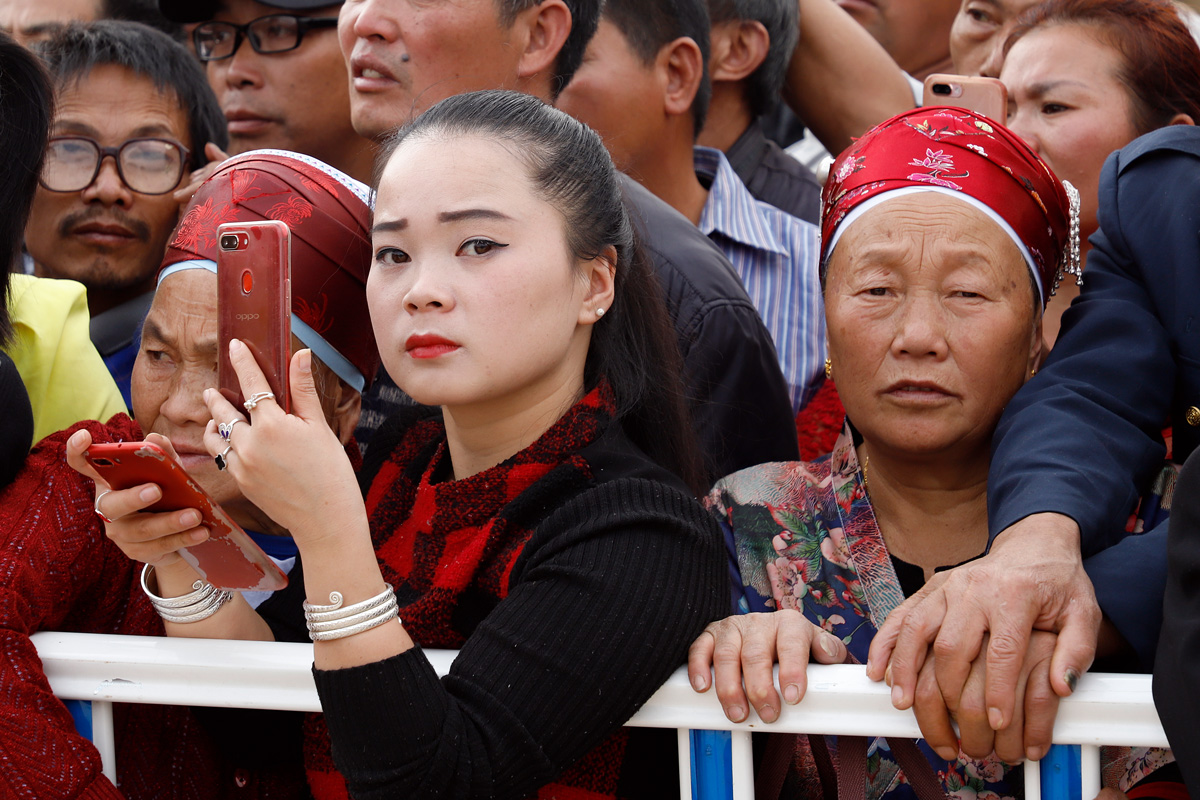 | Gulon, Guizhou, cina 2018. Spettatori alla festa del Lusheng |