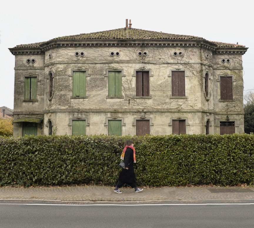 Se ne fanno tante così, ma questa è curiosa. Difficile dire chi sia il soggetto: se la grande casa che ha tratti umani o la ragazza che hai fissato bene al centro e proprio nell' attimo della falcata. Quel che non va è la messa a fuoco imprecisa, la dominante verde eccessiva anche per una scena con tutto quel verde, la distorsione che non fa gioco, la mancanza del bianco. Con qualche intervento la puoi migliorare sotto alcuni aspetti. Ecco un esempio.