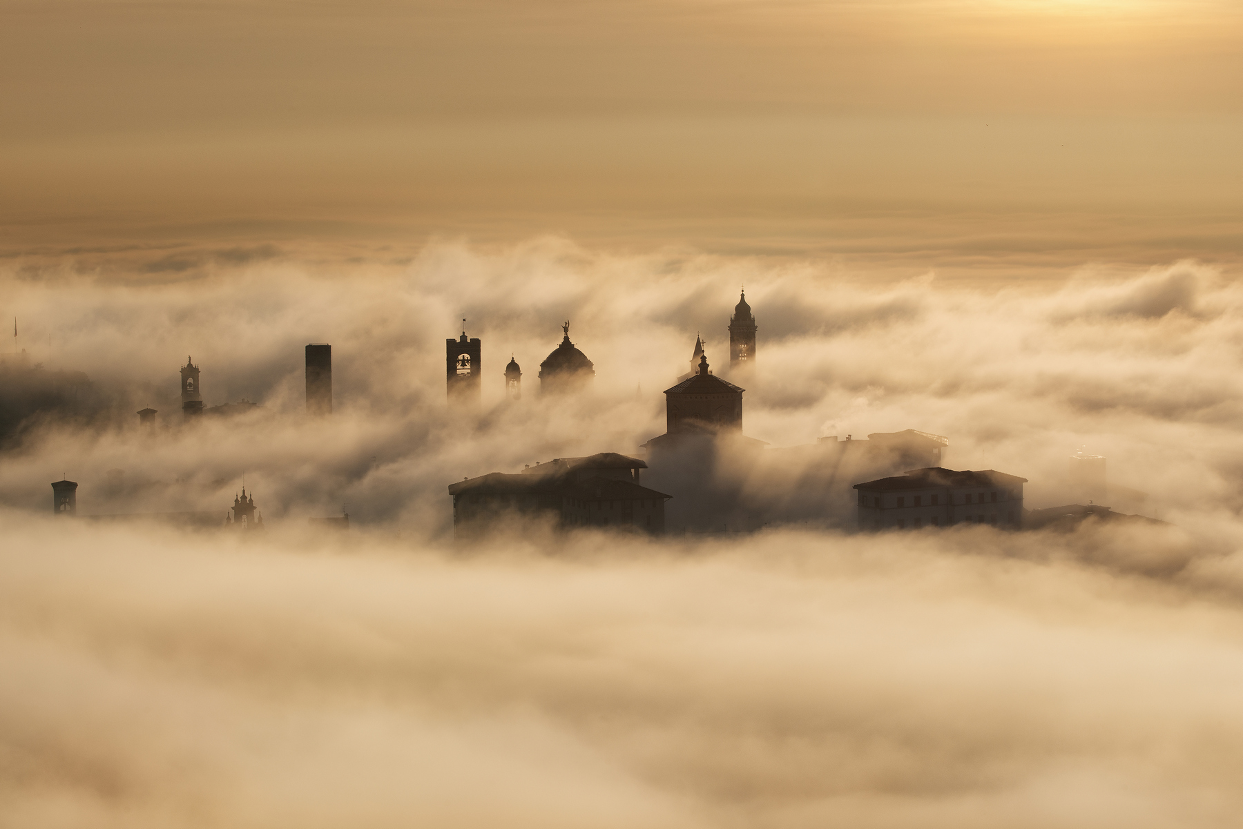 Grandioso l'effetto dei campanili e delle torri che escono all'improvviso dalla nebbia.