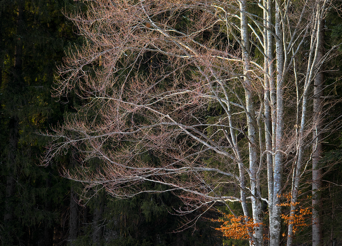 Uno stacco deciso dal fondo scuro, questi rami articolati che si esetndono sulla sinistra rispetto ai tronchi crreano una buona composizione dell'immagine.