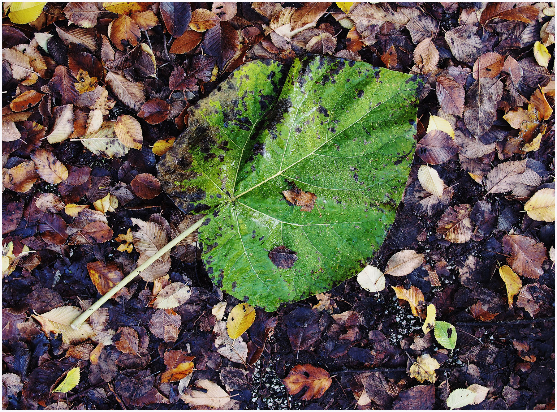 | Una fotografia abbastanza comune, nulla di nuovo. Tuttavia l’apprezzo perché progettata e realizzata in modo molto accattivante ed impeccabile. La prima cosa che salta all’occhio è la contrapposizione molto efficace fra foglia grande e letto di foglioline. grandezza e soprattutto colori diversi. Nello sfondo vi sono i gialli, i marroni chiari e scuri, i grigi ma nulla di verde. anche la disposizione nel frame mi pare azzeccata, con la nervatura principale della foglia che segue la diagonale del fotogramma. Quindi nulla di eclatante come novità ma il tutto è costruito ottimamente per ottenere un effetto grafico molto piacevole.