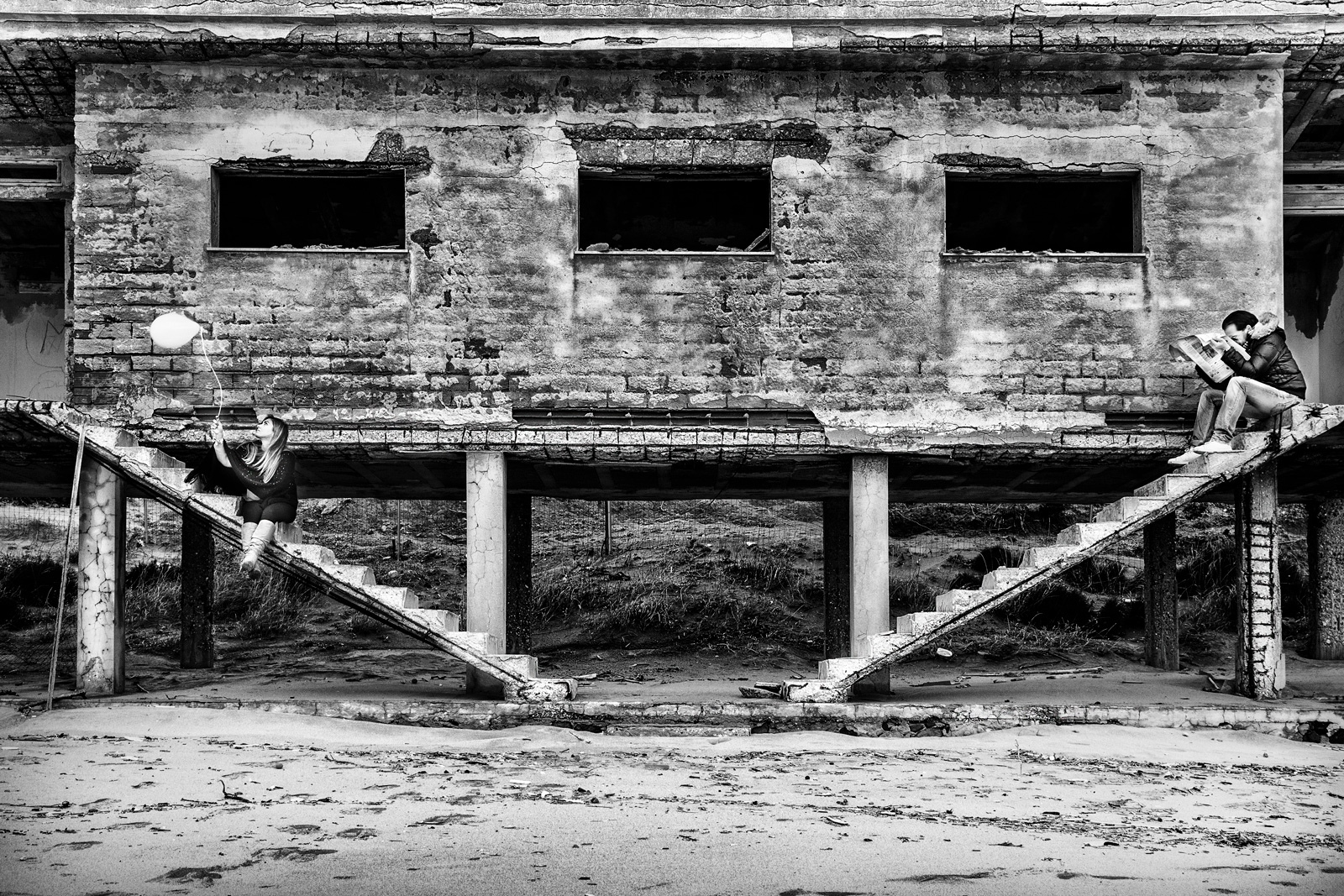 Lui sembra oramai aver perso ogni tipo di speranza, le aspettative non hanno piu modo di bussare a queste porte che, effettivamente come ben si può notare non ci sono, non c'è piu niente qui, non c'è un bel niente da attendere, si fa prima a leggere cosa accade nel resto della penisola. Nonostante ciò, però... ecco che un anima diversa esiste e tenta ancora di smuovere quanto di più può, senza temere quanto di più ovvio si presenta innanzi a lei. Lei ha tentato davvero tutto per convincere il suo compagno ma nulla... nella sfera della fantasia è rimasta sola insieme ad un palloncino che prova a volare e lei con la testa all'insù forse lo invidia per la sua forza/volontà naturale di sollevarsi in cielo. O forse no, magari quel palloncino è l'ultima cosa che le è rimasto per ricominciare tutto daccapo partendo dalla sua forza infantile... l'unica cosa che non muore mai... io sono dalla sua parte con tutto me stesso
