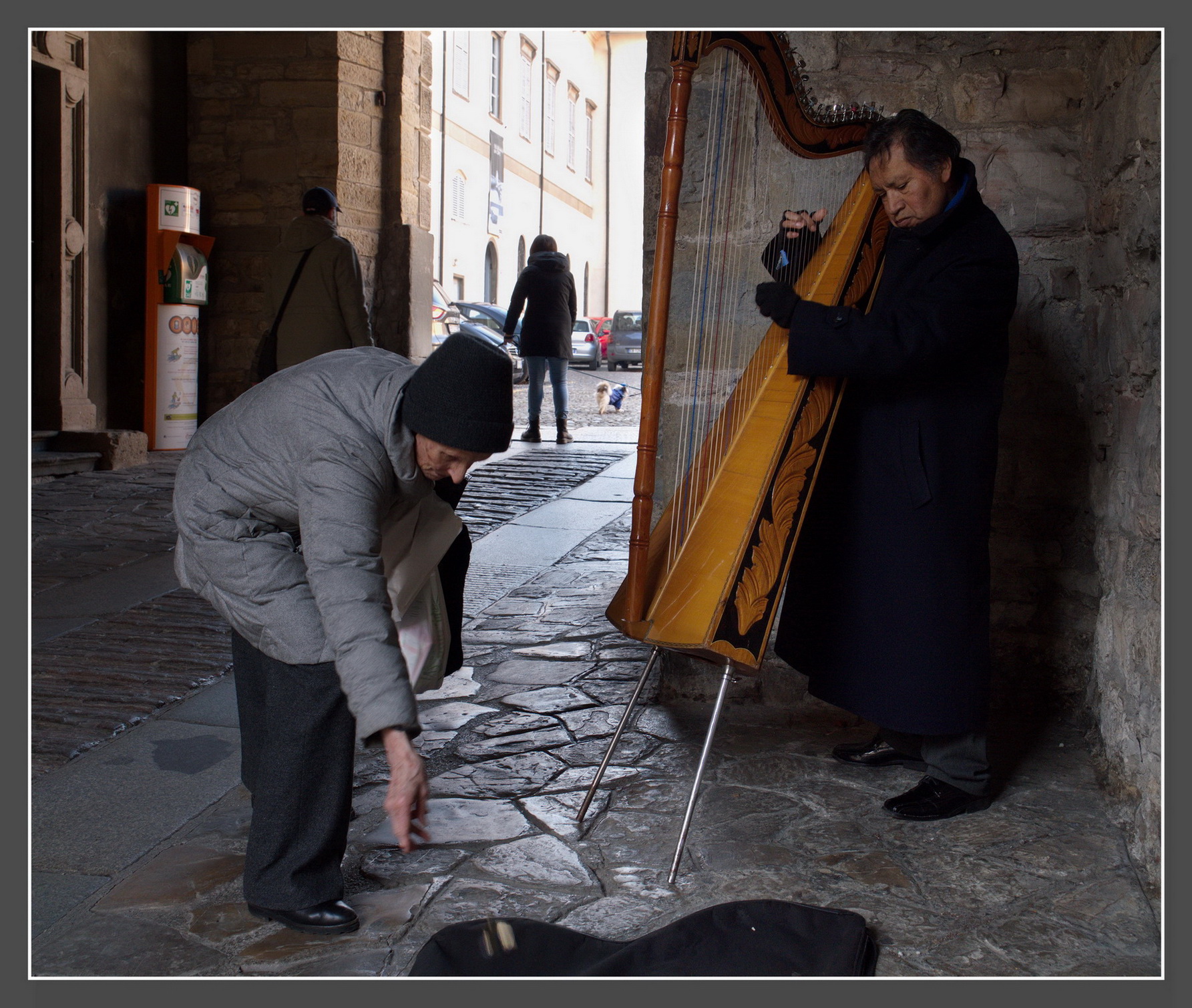 non è il consueto artista di strada. rilevo nel gesto del benefattore una storia di solidarietà umana...mi piace anche l'aria trasognata dell'artista-arpista che sembra voler nascondersi per pudore. Ciao