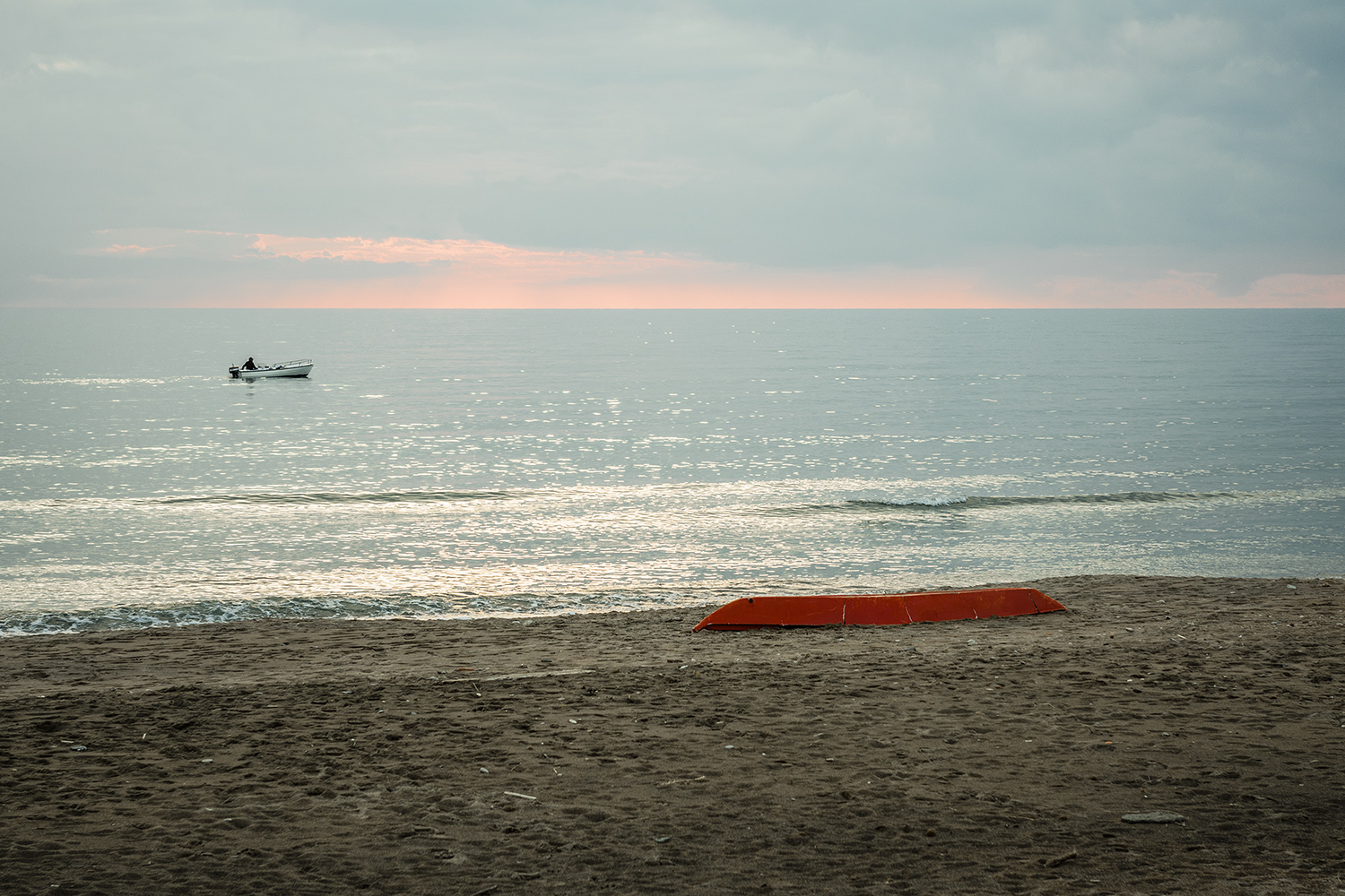 Una contrapposizione tra le due barche, una in navigazione, latra capovolta e a secco.