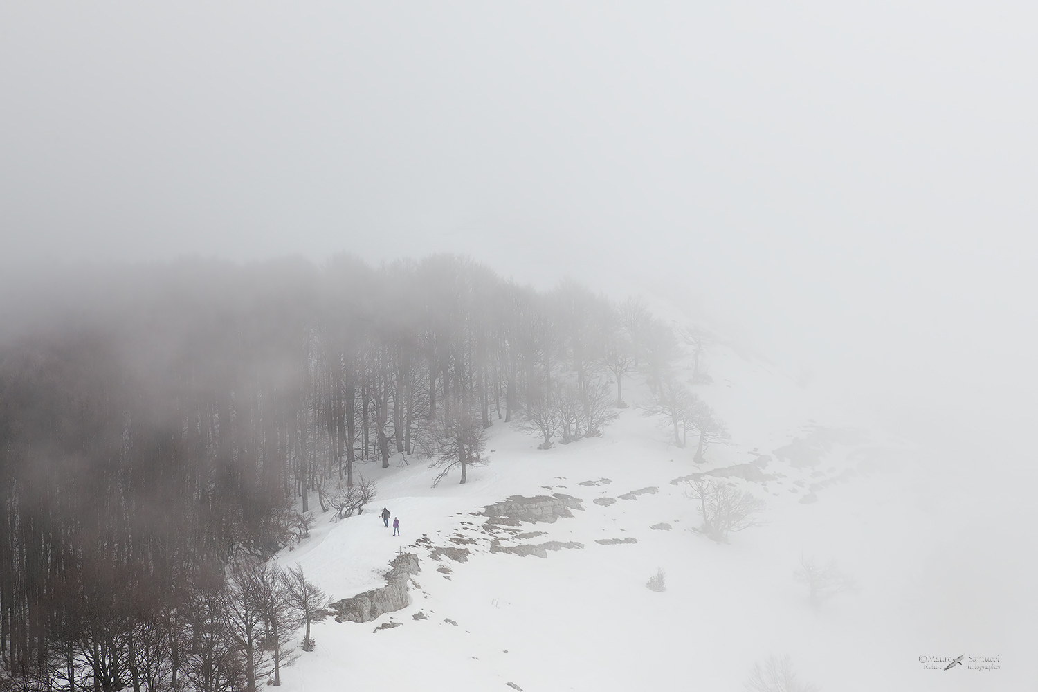Piacevole la ripresa di questi due minuscoli escursionisti, indisturbati a passeggio in questa meravigliosa atmosfera circondata dalla neve..e nebbia..