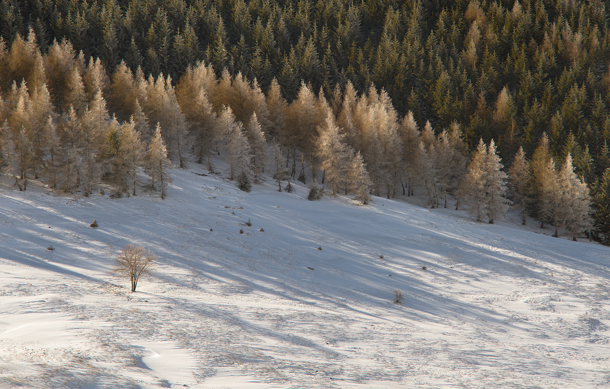 Molto bella, il piccoletto già al sole mentre la luce sfiora appena le cime degli alberi dietro ancora in ombra...buona la composizione e bene il bianco...complimenti