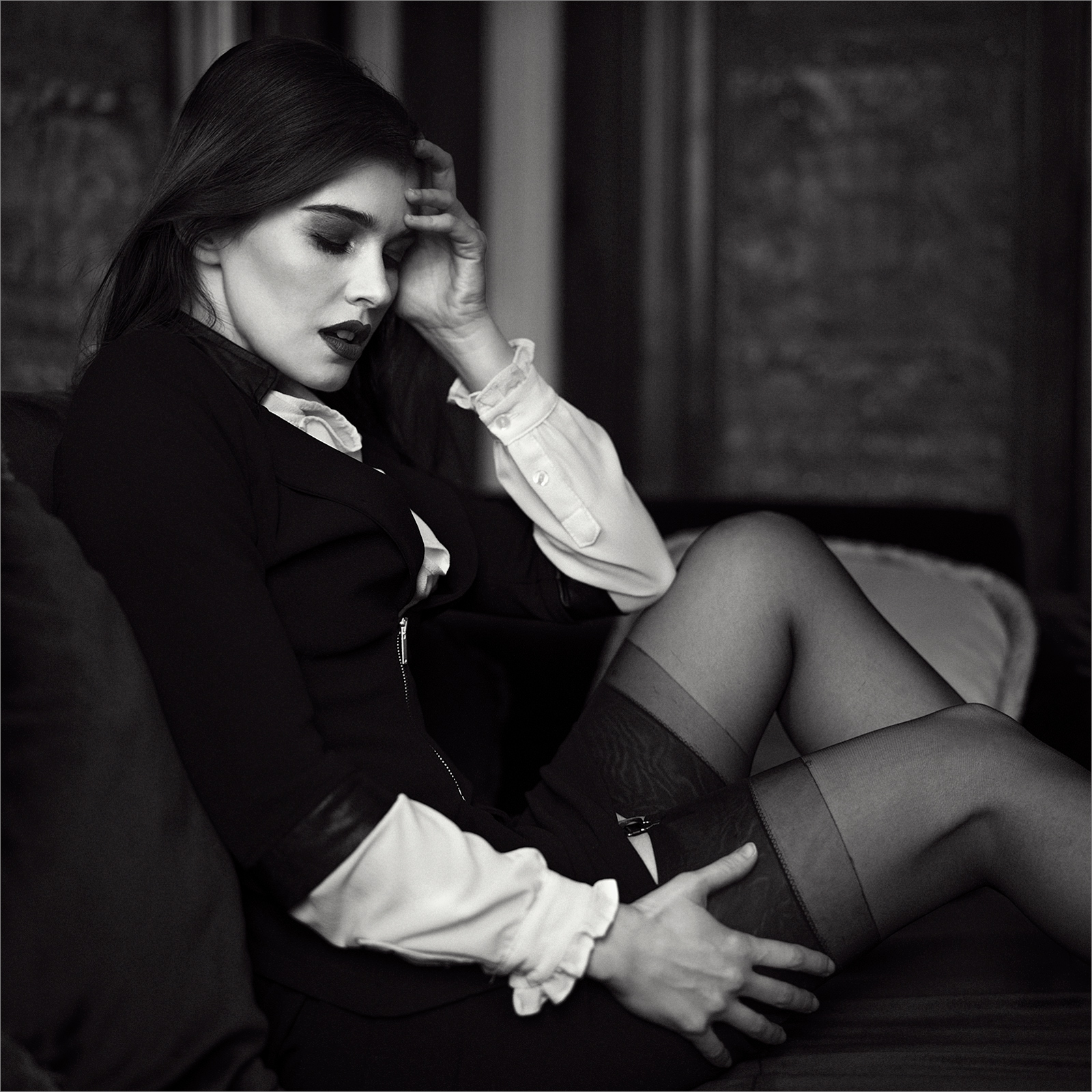 Lei con la sua espressione che incrocia la sensualità con un accenno di dramma è splendida. Tu, da maestro, componi e interpreti questa alternanza chiaroscurale usando in maniera esemplare le geometrie della posa delle gambe e la gestualità delle braccia.