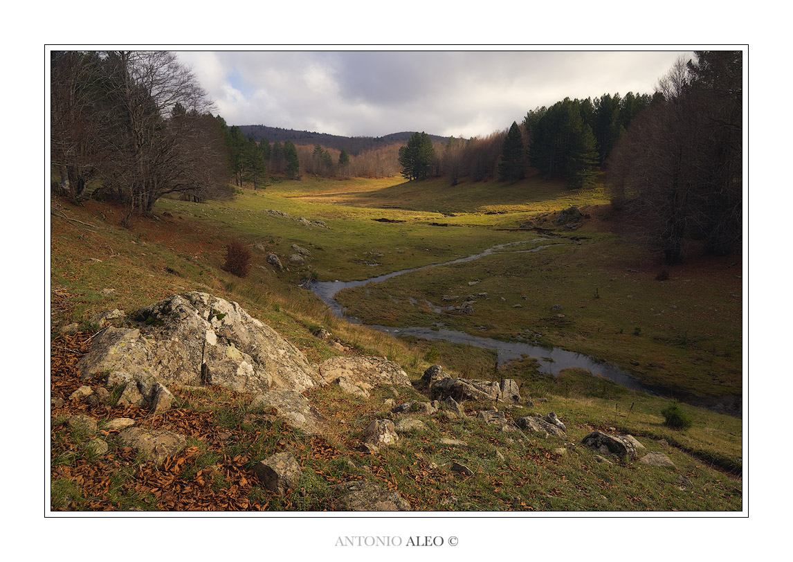 La neve ormai non copre più queste terre e ha lasciato spazio alla delicata calda luce primaverile,che fa splendere i suoi colori, i primi verdi che profumano di vita, che alternandosi con pennellate d'oro scandiscono i piani e ne modellano i volumi.Mi piace come questo rivolo d'acqua ci conduca lontano,zig-zagando lungo la valle. Piacevolissima Ciao