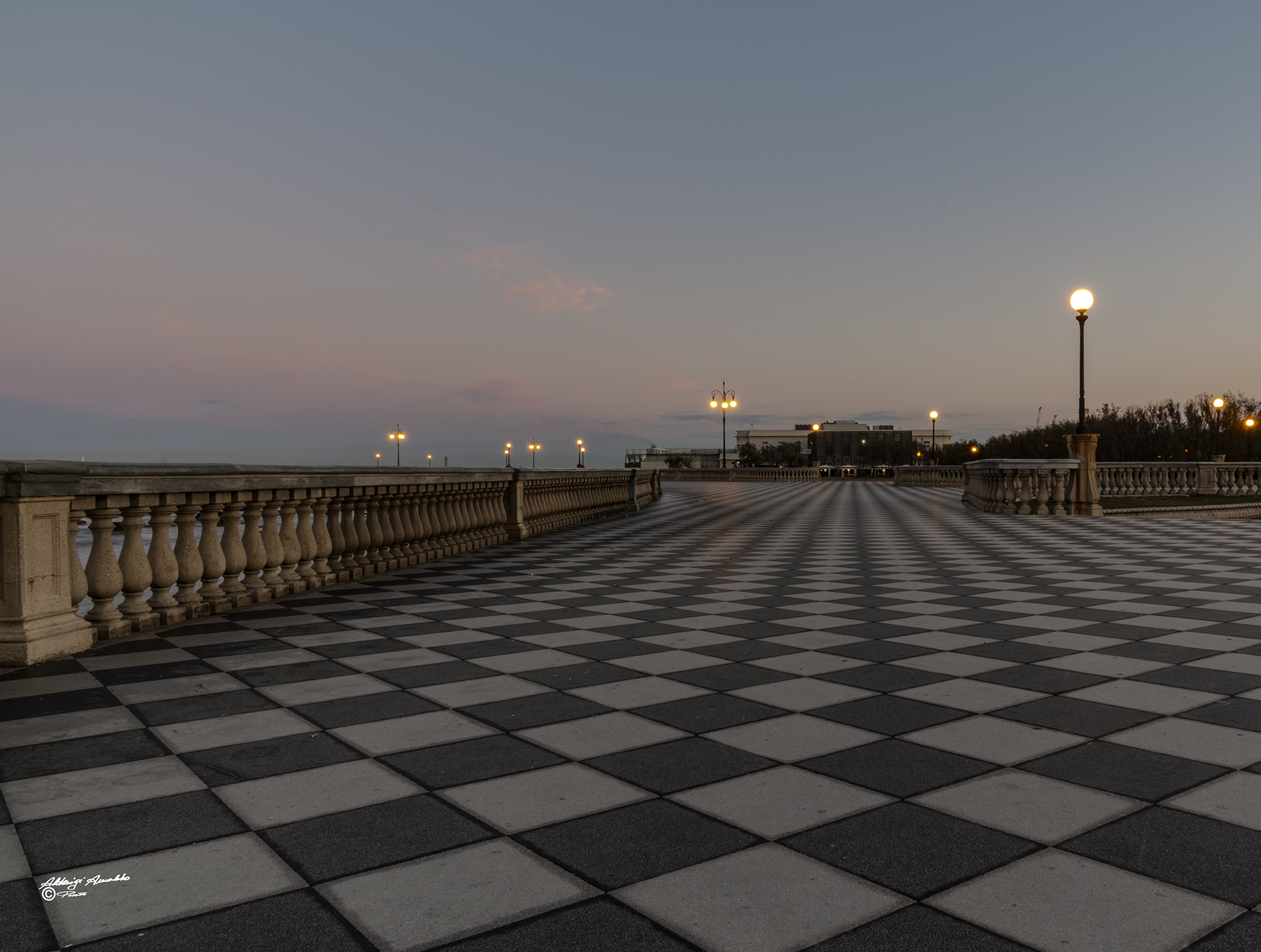 La osservavo in accoppiata alla precedente,ma non so scegliere..due foto molto simili eppure sei riuscito a renderle così diverse.Nella precedente c'era una bella armonia di curve, qui le curve lasciano il posto ad una maggiore pulizia,linee più rigorose che esaltano la profondità della scena. Questa terrazza offre dei bellissimi spunti con questa pavimentazione ipnotica..poi al solito, molto bravo tu a restituire questa atmosfera di assoluta quiete e silenzio. Ciao