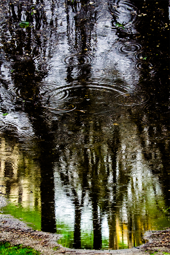 Veramente bella. Elementi riflessi sulla superficie dell’acqua ma resi frammentari dal movimento provocato dalle gocce. Elementi indefiniti e pure macchie e forme di scuro sopra lo specchio lucido dell’acqua. Molto accattivante e capace di sfociare in un’immagine che sembra quasi una tavolozza e si estranea dalla sua realtà, si estranea dall’essere semplice riflesso di elementi comuni e reali….per tale motivo io toglierei ogni elemento concreto, reale. Toglierei via tutto quanto è pienamente interpretabile, quasi un’ancora verso il tangibile. Insomma, toglierei tutta la parte inferiore con la costa/margine terroso.