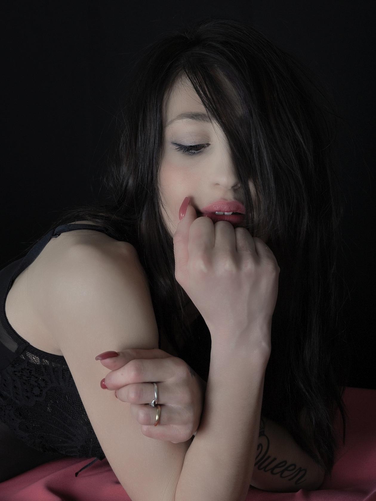 Compo che non mi convince, il gomito tagliato qui non lo trovo corretto. Lei è molto seducente. La pelle desaturata è un tuo stile personale che non condivido ma che rispetto.  |