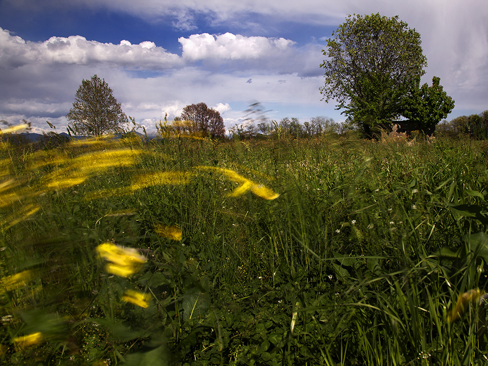 atmosfera tipicamente primaverile, cieli azzurri punteggiati di nuvole e il vento che regala pennellate di giallo nei prati, mi piace