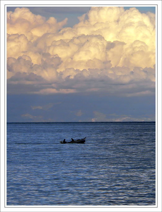 Avrei dato un po' di spazio in alto per non tagliare la nuvola e tolto qualcosa in basso per accentuare l'effetto di "caduta" sui pescatori.