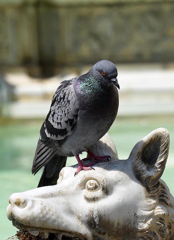 Personalmente avrei abbassato un po' il PDR ad includere l'intera testa della statua: il parallelismo/contrasto tra occhi e bocca di piccione e statua avrebbe reso molto bene.