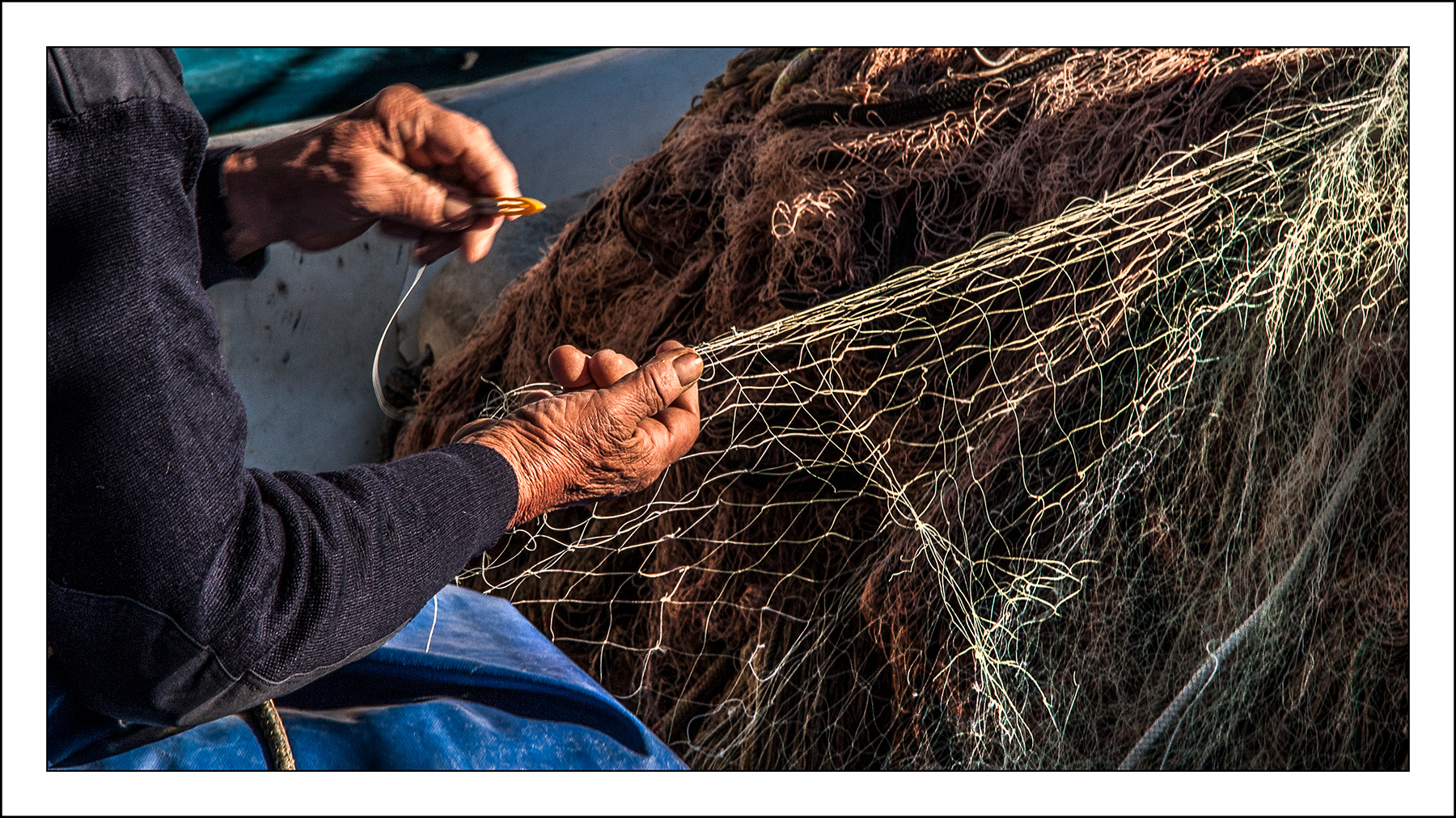 Molto bella la ripresa delle mani del pescatore che si accinge a riparare le reti per la prossima pesca..Belli i colori. Buona serata.